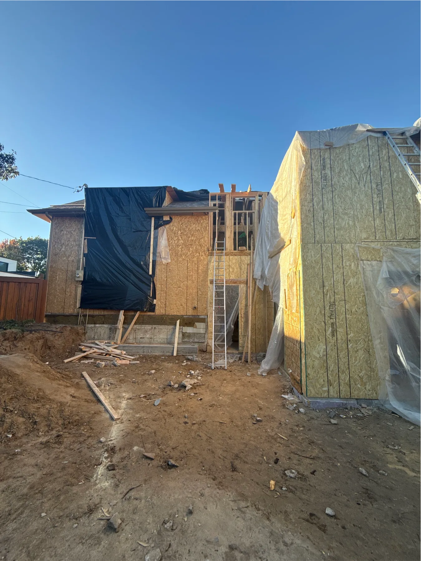 We’ve begun the transition from demo to building. We’ve replaced the exterior OSB in panels that had been damaged over the life of the house. We’ve also backfilled the hole along the fence by the new stairwell windows. We’re closing up old openings and framing the new rough openings for windows and doors. Next, we anticipate the arrival of the new steel beams to continue the framing process.